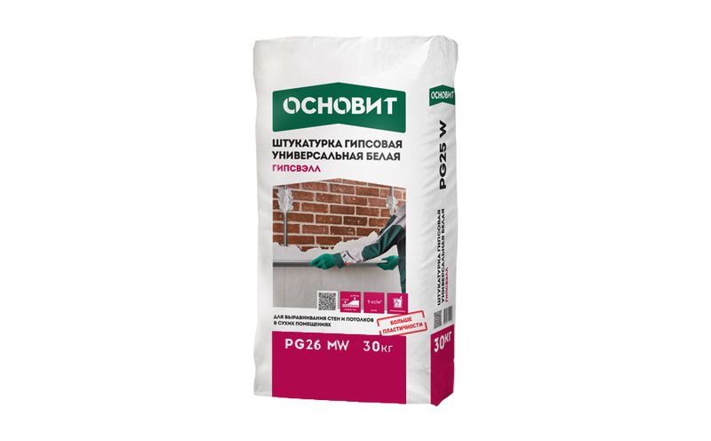 Штукатурка ОСНОВИТ ГИПСВЭЛЛ PG26 MW изготовлена на основе гипса. Материал служит для выравнивания потолков и стен в помещениях с нормальным влажностным режимом. Основаниями для нанесения могут служить: бетонные, кирпичные, газо- и пенобетонные, гипсовые основания, а также ЦСП, ГВЛ, ГКЛ. Явными преимуществами данной сухой смеси являются высокая паропроницаемость и экономичный расход. Раствор позволяет создать ровную и гладкую поверхность без необходимости дальнейшего шпаклевания.